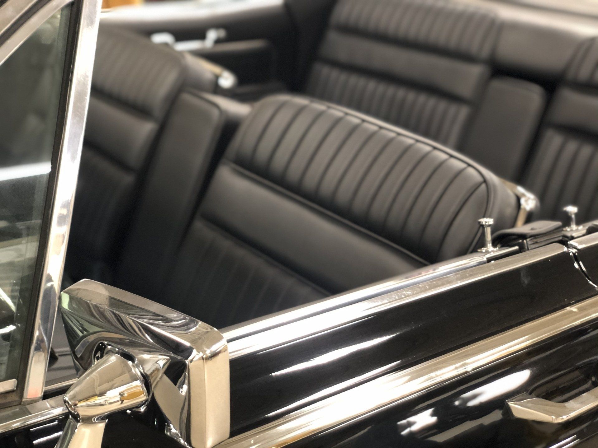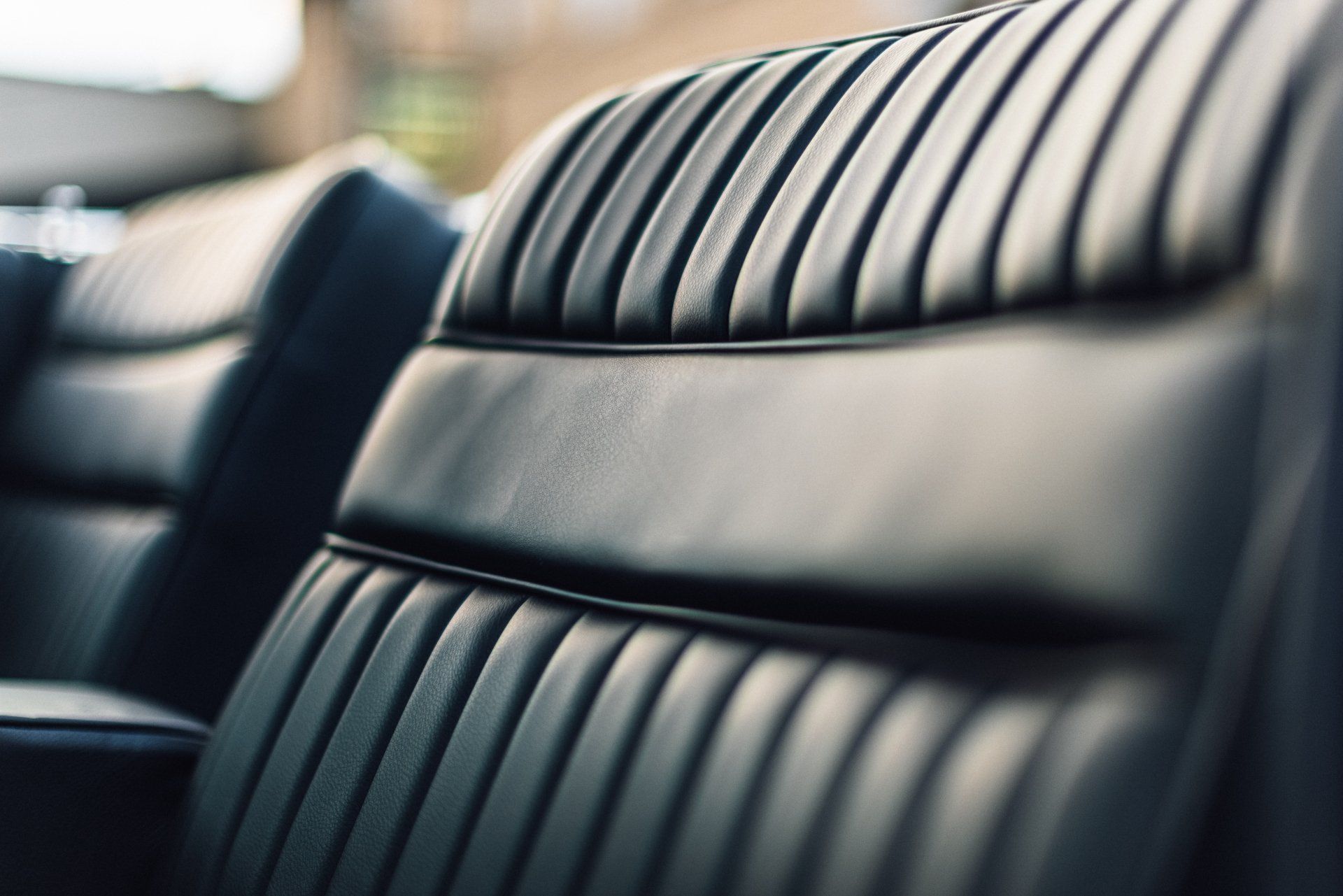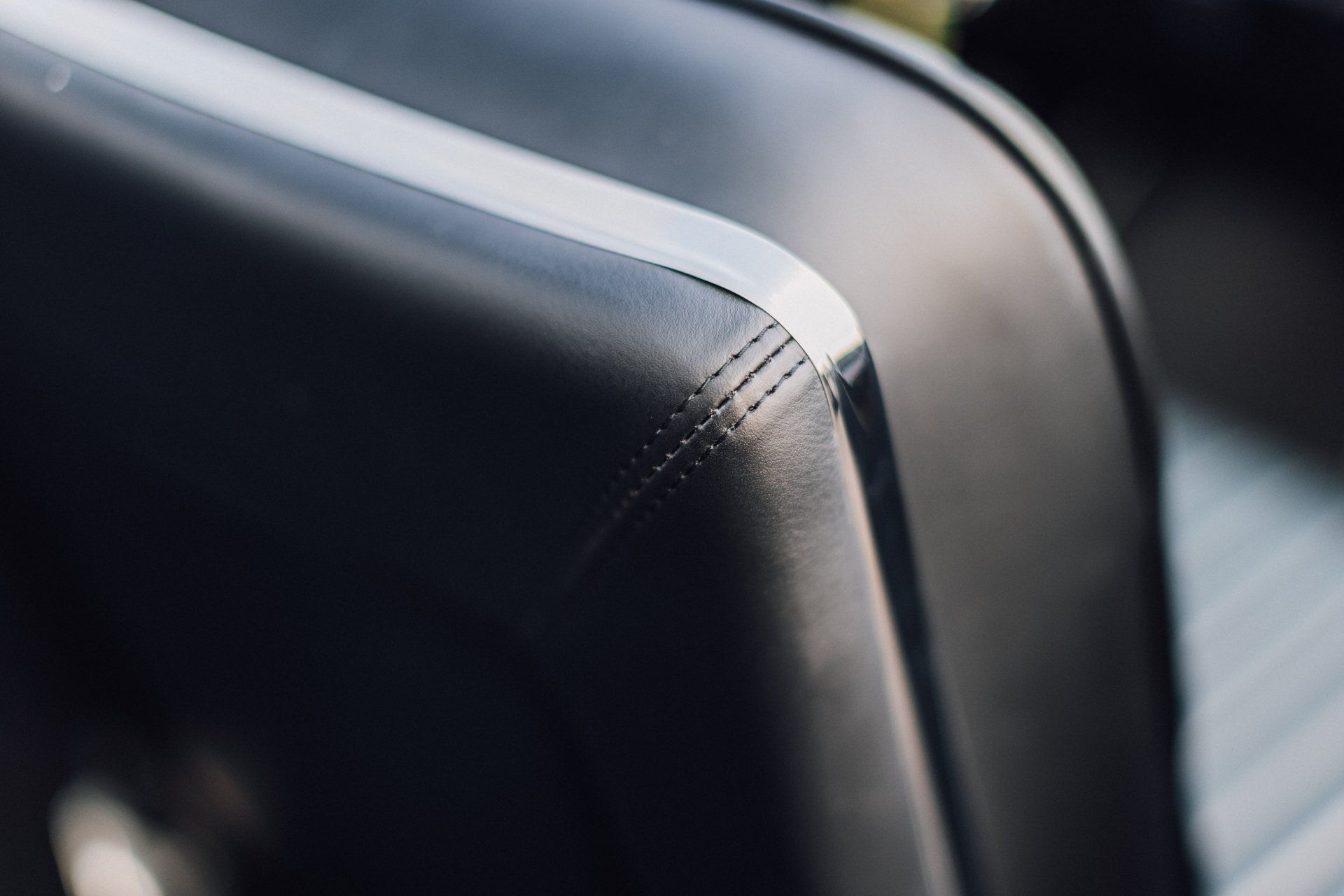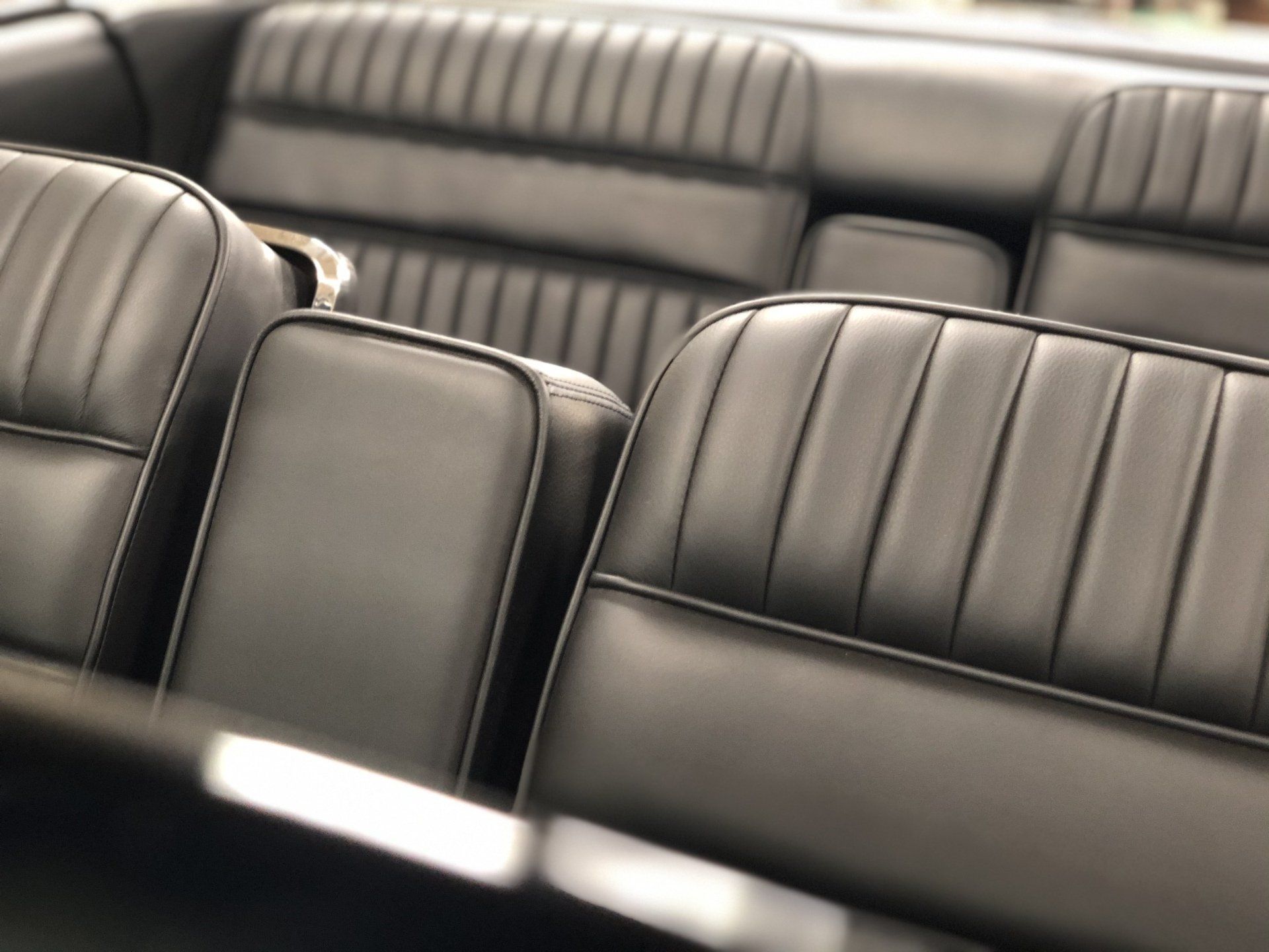 Custom interior using original factory seat design and upgrading materials to leather and custom sewn to fit German Square Weave carpet
